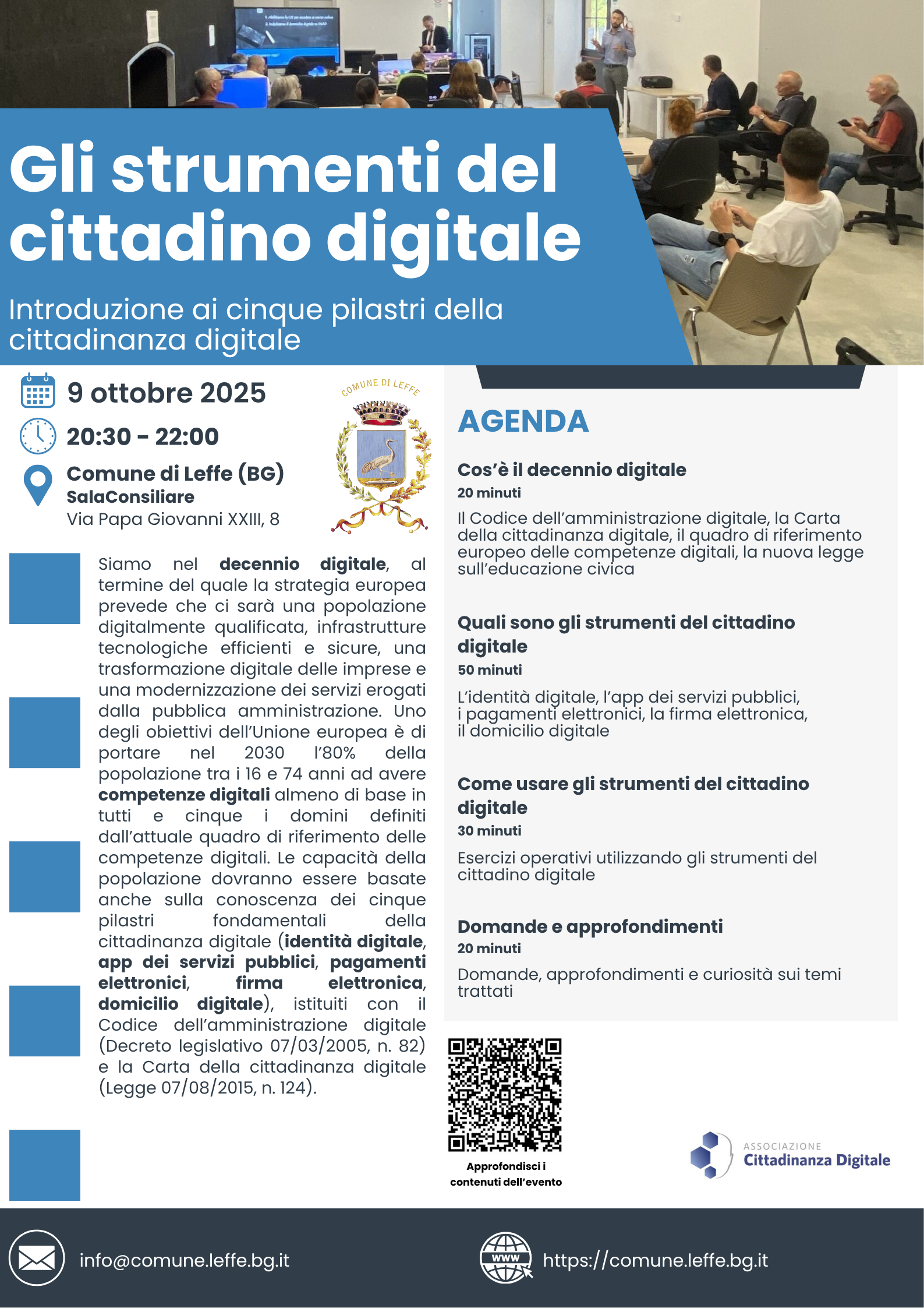 L’assessorato alla digitalizzazione ed informatizzazione del Comune di Leffe e l’Associazione Cittadinanza Digitale presentano un primo appuntamento sugli strumenti del cittadino digitale con un incontro dal titolo “Introduzione ai cinque pilastri della cittadinanza digitale” con il fine di avvicinare la cittadinanza agli strumenti digitali e sensibilizzarla su tale tema.